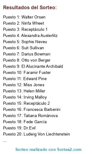 Lista de participantes: Alexandra Austerlitz, Cornelio Agrippa, Darius Bowman, Dr.Evil, Edward Pine, El Alucinante Archibald, Faramir Fuster, Fede García, Francesca Barberini, Helen Miller, Irving Malloy, Ludwig Von Liechtenstein, Miss Jones, Montgomery Manhunt, Ninfa Wheet, Otto von Berger, Sophie Neveu, Suit Sullivan, Tatiana Románova, Walter Orsen, Receptáculo 1, Receptáculo 2.