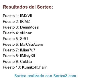 Lista de participantes: Arienek, xFashionBVx, Celdita, Lly1ss3thll, lbelax3, yNinaz, lEliiza, Antojos, Nixiel, Henval, landylx, DivineDepravation, Sr91, iPalt, Aelin, Haruma, Vinnus, 0Punpun, Zianns, Demanda, Misukibuni, Vickytg, Dixwel, Ciemny, Aisuh, XZHIAX, Kaov, ISherlie, xCryOut, MeiHs, oALeej, UnicorniaCx, lNayre, iZoyah, Peluda, lJennMossl, RuthScarlet, llMistyKll, AlesTerranova, IIKattyII, Valenszinc, xLspinLx, LuciaGucciPickett, lEiffel, macarena7v7, xXScarletSinZXx, Cynthia, RouxTerranova, Emireth, Sefex, lMiau7u7, Desordenada, DeinaBD19, lRocioBl, EmoAnne96, lNirala, IMarlenyx3II, Neyzha, Jedrezy, LPerluSM, llSehun, Heclipse, iHattie, iTziie, MalCriaAcero, AndreaPickettRicci, Keihra, r6u6leslie6u6r, lTefyl, Kzixy, Tornasol, lSofii, DannyySamBoricua, xELISHx, Nezzha, KumikollChalin, Kurly, lNATUl, MinYoongi7u7, xALISHx, Lhilii, IKlMZ, Alejandravic, Xuez, Carito, Zasory, xZwh, IsisGore, Houls, Nhiav, Nahitz, llMXVll, Yisuszmg, llxZoelixll.