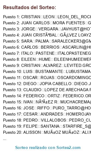- Puesto 1: CRISTIAN LEON LEON_DEL_ROCK79@HOTMAIL.COM 200826213 SANTIAGO