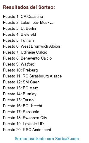 Lista de participantes: Benevento Calcio, Levante UD, Udinese Calcio, SM Caen, Fulham, Sassuolo, West Bromwich Albion, Swansea City, Lokomotiv Moskva, Torino, RSC Anderlecht, Burnley, Watford, Bielefeld, U. Berlin, Freiburg, RC Strasbourg Alsace, FC Utrecht, CA Osasuna, FC Metz.