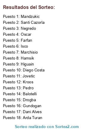 Lista de participantes: Isco, Pedro, Oscar, Gundogan, Balotelli, Kroos, Marchisio, Hamsik, Higuain, Santi Cazorla, Dani Alves, Negredo, Drogba, Jovetic, Mandzukic, Diego Costa, Arda Turan, Farfan.