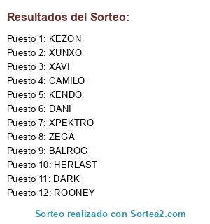Lista de participantes: ROONEY, CAMILO, BALROG, DARK, XPEKTRO, HERLAST, DANI, KEZON, XUNXO, ZEGA, XAVI, KENDO.