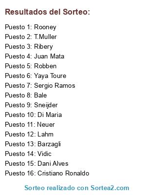 Lista de participantes: Sneijder, Rooney, Neuer, Barzagli, Juan Mata, Cristiano Ronaldo, Dani Alves, Sergio Ramos, Yaya Toure, Di Maria, Bale, Robben, Lahm, Vidic, Ribery, T.Muller.