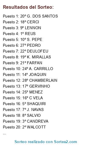 Lista de participantes: 1º REUS, 2º WALCOTT, 3º CANDREVA, 4º CUADRADO, 5º SHAQUIRI, 6º NANI, 7º J. NAVAS, 8º SALVIO, 9º LENNON, 10º S. PEPE, 11º MAGGIO, 12º S. SAM, 13º VALENCIA, 14º JOAQUIN, 15º BLASZCZYKOSWKI, 16º C VELA, 17º GERVINHO, 18º CERCI, 19º K. MIRALLAS, 20º G. DOS SANTOS, 21º FARFAN, 22º DEULOFEU, 23º ZAHA, 24º A. CARRILLO, 25º MENEZ, 26º ITURBE, 27º PEDRO, 28º CHAMBERLAIN.