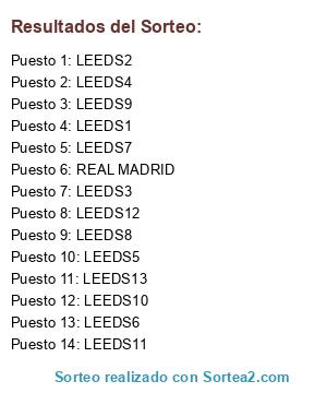 Lista de participantes: REAL MADRID, LEEDS1, LEEDS2, LEEDS3, LEEDS4, LEEDS5, LEEDS6, LEEDS7, LEEDS8, LEEDS9, LEEDS10, LEEDS11, LEEDS12, LEEDS13.