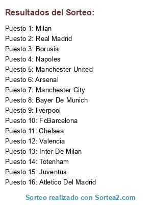 Lista de participantes: FcBarcelona, Real Madrid, Atletico Del Madrid, Valencia, Inter De Milan, Milan, Juventus, Napoles, Arsenal, Manchester City, Manchester United, Chelsea, Totenham, Bayer De Munich, Borusia, liverpool.