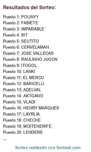 Lista de participantes: CHECHE, BARICELLI, LENDERS, RAULINHO JUGON, POLINYY, ADELVAL, HENRY MARQUES, LANKI, ITOGOL, KARLITOS, DIEGOL, DAR-K, RAFAE, FABIETE, SULLYBAN, BIT, SEUTITO, AKTGANO, JOSE VALLECAS, IMPARABLE, MAKAROOV, VLADI, EL MERCU, CERVELAMAN, LAYRLIA, MOITENERIFE.