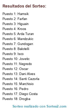 Lista de participantes: Isco, Pedro, Oscar, Gundogan, Balotelli, Kroos, Marchisio, Hamsik, Higuain, Santi Cazorla, Dani Alves, Negredo, Drogba, Jovetic, Mandzukic, Diego Costa, Arda Turan, Farfan.