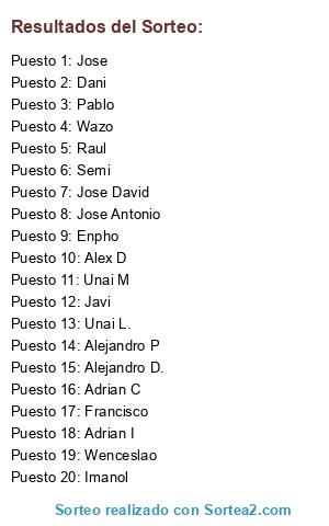 Lista de participantes: Alejandro P, Unai L., Alejandro D., Imanol, Wazo, Jose David, Unai M, Adrian C, Adrian I, Jose Antonio, Wenceslao, Enpho, Jose, Alex D, Javi, Raul, Dani, Semi, Francisco, Pablo.