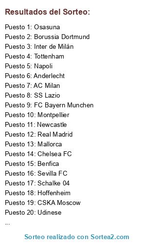 Lista de participantes: Oporto FC, Fenerbahçe Spor Kulübü, Real Madrid, Juventus, Inter de Milán, Manchester City FC, Chelsea FC, SS Lazio, Tottenham, AC Milan, Sevilla FC, Benfica, PSV, Schalke 04, Hoffenheim, FC Bayern Munchen, Osasuna, FC Barcelona, Newcastle, Mallorca, CSKA Moscow, Napoli, Catania, Borussia Dortmund, Bolonia, Everton, Montpellier, Anderlecht, Valencia, Arsenal FC, Udinese.