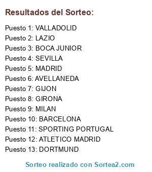 Lista de participantes: AVELLANEDA, DORTMUND, SEVILLA, MILAN, SPORTING PORTUGAL, LAZIO, GIRONA, BOCA JUNIOR, GIJON, VALLADOLID, MADRID, ATLETICO MADRID, BARCELONA.