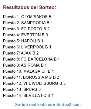 Lista de participantes: LIVERPOOL B 1, SPURS 3, AS ROMA B 1, FC PORTO B 2, SAMPDORIA B 1, NAPOLI B 1, OLYMPIAKOS B 1, SEVILLA FC B 1, BORUSSIA MG B 2, AJAX B 2, VFL WOLFSBURG B 3, EVERTON B 3, MALAGA CF B 1, FC BARCELONA B 1.