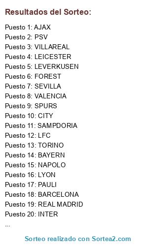 Lista de participantes: REAL MADRID, FOREST, BENFICA, BAYERN, BARCELONA, AJAX, VILLAREAL, INTER, LEICESTER, VALENCIA, NAPOLO, AMERICA, WOLVES, BOCA, SPURS, LYON, SEVILLA, BVB, SAMPDORIA, PAULI, MILAN, LILLE, LFC, CITY, TORINO, BETIS, LEVERKUSEN, PSV.