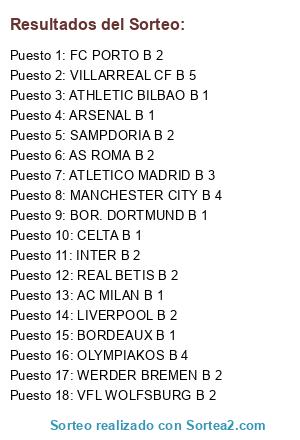 Lista de participantes: INTER B 2, REAL BETIS B 2, AS ROMA B 2, BORDEAUX B 1, BOR. DORTMUND B 1, MANCHESTER CITY B 4, VILLARREAL CF B 5, AC MILAN B 1, OLYMPIAKOS B 4, FC PORTO B 2, ATHLETIC BILBAO B 1, SAMPDORIA B 2, WERDER BREMEN B 2, LIVERPOOL B 2, CELTA B 1, ATLETICO MADRID B 3, VFL WOLFSBURG B 2, ARSENAL B 1.