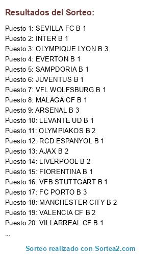 Lista de participantes: SAMPDORIA B 1, FIORENTINA B 1, INTER B 1, VALENCIA CF B 2, SEVILLA FC B 1, AS ROMA B 2, ARSENAL B 3, OLYMPIQUE LYON B 3, VILLARREAL CF B 1, MANCHESTER CITY B 2, MALAGA CF B 1, LEVANTE UD B 1, LIVERPOOL B 2, OLYMPIAKOS B 2, JUVENTUS B 1, FC PORTO B 3, EVERTON B 1, AJAX B 2, REAL MADRID CF B 3, RCD ESPANYOL B 1, SPORTING CP B 3, VFL WOLFSBURG B 1, VFB STUTTGART B 1.