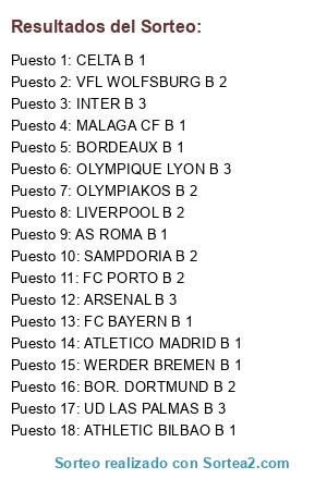 Lista de participantes: UD LAS PALMAS B 3, ATHLETIC BILBAO B 1, INTER B 3, OLYMPIAKOS B 2, BOR. DORTMUND B 2, SAMPDORIA B 2, FC PORTO B 2, BORDEAUX B 1, CELTA B 1, ARSENAL B 3, AS ROMA B 1, LIVERPOOL B 2, MALAGA CF B 1, FC BAYERN B 1, ATLETICO MADRID B 1, VFL WOLFSBURG B 2, OLYMPIQUE LYON B 3, WERDER BREMEN B 1.