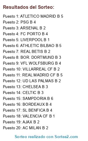 Lista de participantes: ATHLETIC BILBAO B 5, BORDEAUX B 4, REAL MADRID CF B 5, AC MILAN B 2, SAMPDORIA B 6, UD LAS PALMAS B 2, PSG B 4, FC PORTO B 4, CELTIC B 3, BOR. DORTMUND B 3, AJAX B 2, SL BENFICA B 4, LIVERPOOL B 1, VALENCIA CF B 1, CHELSEA B 3, REAL BETIS B 2, ATLETICO MADRID B 5, VFL WOLFSBURG B 4, VILLARREAL CF B 2, ARSENAL B 2.
