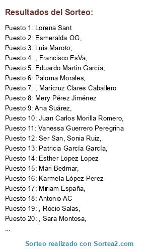 Lista de participantes: Michelle Romero, Ana Suárez, Mari Angeles Peruiz, Juan Carlos Morilla Romero, Noelia Serrano Muñoz, Luisa Jiménez Barranco, Antonio AC, Lorena Sant, Karmela López Perez, Inma Chacón, Marta Ro Re, Mery Pérez Jiménez, Clares Caballero, Susana Aragón Montes, Rocio Salas, Esther Lopez Lopez, Francisco EsVa, Vanessa Guerrero Peregrina, Sara Montosa, Esmeralda OG, Yolanda Paz, Consuelo Caba Martin, Paloma Morales, Ser San, Sonia Ruiz, Ceci García García, Eduardo Martin García, Patricia García García, Mari Bedmar, Miriam España, Luis Maroto, Mary Arco, José Manuel Baena, Loris.1712, Davidgrx_9, Jairoibra, zaidasvd, patriloxa, isaazs4, al764196, lilyssly88, martamontosa, baenaventura, _____karmela_____, javelrayo.