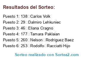 Lista de participantes: 1 Javier De Soza, 2 Diego Sebastian Bermudez, 3 Daniel Cristin, 4 Mariano Guerrero, 5 Flavio Del Prato, 6 Pablo Dorigo, 7 Juan Ignacio Venzano, 8 Cynthia Rozas Sanchez, 9 Juan Fernandez, 10 Barbara Fernandez, 11 Eliana Rossi, 12 Pablo Delpiero, 13 Cecilia Ayesta, 14 Alejandro Sobrino, 15 Brisanoff Daniela, 16 Federico Jalile, 17 Patricio Saure, 18 Ariel Gomez, 19 Ludmila Piferrer, 20 Jana Diaz, 21 Juan Carlos Bera, 22 Juan Carlos Bera (H), 23 Matias Bera, 24 Florencia De Biaggio, 25 Daniela Herjo, 26 Agustin Gibezzi, 27 Matias Patiño, 28 Damian Tupone, 29 Dalmiro Lehkuniec, 30 Omar Mendonca, 31 Roxana Paklain, 32 Matias Paklain, 33 Dalina Acosta, 34 Veronica Pereyra, 35 Rocio Yasmila Navia, 36 Barbara Sotelo, 37 Marcelo Ziccarelli, 38 Cristian Mellid, 39 Maximilano Cisneros, 40 Hernan Panetta, 41 Nahuel Suarez, 42 Gonzalo Esteinou, 43 Gaston Bertinetti, 44 Julian Calvo, 45 Maria Eugenia Calvo, 46 Eliana Cragno, 47 Dario Distefano, 48 Soledad Recio, 49 Rodrigo Fernandez, 50 Cristian Ruiz, 51 Alejandro Nusdeo, 52 Bernardino Godoy, 53 Carlos Daniel Ibarra, 54 Romina Flores, 55 Esteban Monoli, 56 Angel Comes, 57 Nicolas Comes, 58 Pablo Comes, 59 Maria Paula Ruiz, 60 Romina Giudici, 61 Leandro Coggiola, 62 Hernando Villa, 63 Mauro Russo, 64 Nahuel Volpe, 65 Jonatan Alexis Avellaneda, 66 Julian Andres Rijetkovic, 67 Juan Pablo Pacenzia, 68 Augusto Galeppi, 69 Juan Manuel Pizarro, 70 Hernan Ezequiel Acosta, 71 Alan Fernando Chavarria, 72 Ruben Dario Fernandez, 73 Alejandro Leonel Albasetti, 74 Eduardo Gallego, 75 Guadalupe Gallego, 76 Ines Ferreyra, 77 Marcos Ordoñez, 78 Patricio Ramos Gomez, 79 Ezequiel Lopez Navarrete, 80 Claudio Capello, 81 Martin Viqueira, 82 Facundo Cruz, 83 Alan Guillermo Diaz, 84 Guillermo Diaz, 85 Horacio Passarelli, 86 Luciano Passarelli, 87 Florencia Passarelli, 88 Patricio Goy, 89 Mauro Gonzalez, 90 Eduardo Fernandez, 91 Sebastian Ariel Pirillo, 92 Pablo Seoane, 93 Adrian Sarmiento, 94 Eraso Martinez, 95 Mariano Castro, 96 Tomas Kogan, 97 Patricio Scalise, 98 Federico Otero, 99 Santiago Javier Garcia, 100 Leandro Thiermann, 101 Matias De Sousa, 102 Franco Sanchez, 103 Cristian Reniero, 104 Catriel Kunz, 105 Matias Quintana, 106 Ignacio Nazarevich, 107 Ariel Bulacio, 108 Ignacio Lopez Cuellar, 109 Pablo Cisterna, 110 Mariano Santonocito, 111 Emanuel Mori, 112 Fernando Lazo, 113 Martin Yañez, 114 Marcelo Guanca, 115 Pablo Arguello, 116 Matias Perez, 117 Luciano Gianquinto, 118 Cristian Bayonne, 119 Daniel Fuentes, 120 Matias Alderetes, 121 Angel Alderetes, 122 Matias Disipio, 123 Luciano Taraciuk, 124 Dario Rodriguez, 125 Guido Gonzalez, 126 Luis Alberto Gonzalez, 127 Maximiliano Esposito, 128 Nicolas Karpow, 129 Fernando Martinez, 130 Juan Santander, 131 Eduardo Triller, 132 Andrew Triller, 133 Damian Torres, 134 Ariel Pasquale, 135 Noelia Leunis, 136 Claudio Larrosa, 137 Ezequiel Suarez, 138 Carlos Volk, 139 Gaston Sgritta, 140 Aldo Petri, 141 Pablo Gomez, 142 Leonardo Formano, 143 Natalia Balzano, 144 Jorge Balzano, 145 Nancy Vietra Keller, 146 Cristian Ruiz, 147 Axel Milton Mareño, 148 Fernando Lopez, 149 Lisandro Rodriguez, 150 Patricio Perez Sagula, 151 Luciano Banicki, 152 Nicolas Corvatta, 153 Matias Sabatini, 154 Gustavo Torterola, 155 Luis Rivas, 156 Ruben Mendonca, 157 Esteban Ciale, 158 Matias Martinez, 159 Gustavo Pazo, 160 Fabian Centenaro, 161 Joaquin Narvaez, 162 Emiliano Del Giudice, 163 Juan Brignone, 164 Ezequiel Albolian, 165 Adrian Fortino, 166 Agustin Alvarez, 167 Cesar Pavlotzky, 168 Eliana Villaruel, 169 Federico Peña, 170 Franco Chavarria, 171 Gaston Lamas, 172 Maria Jose Salerno, 173 Martin Fasah, 174 Matias Mazlat, 175 Nicolas Girolmini, 176 santiago Salvador, 177 Tamara Paklaian, 178 Alejandro Pugliese, 179 Damian Disipio, 180 Francisco Rodriguez, 181 Gonzalo Argento, 182 Leandro Alvarez, 183 Leandro Decanio, 184 Maria Rocio Buzeta, 185 Maria Sol Roshen, 186 Mariano Pugliese, 187 Priscila Araya, 188 Roberto Pardo, 189 Osvaldo Cavillon, 190 Tomas Cavillon, 191 Gustavo Kissam, 192 Juan Ferrari, 193 juan Prieto, 194 Matias Morales, 195 Federido Girado, 196 Francisco Rossi, 197 Gabriela Bussolotti, 198 Jorge Calvelo, 199 Mariela Silva, 200 Victor Perez, 201 Walter Alberozzi, 202 Fernando Alvarez, 203 Geronimo Escudero, 204 Santiago Stanchina, 205 Nicolas Ruiz Segovia, 206 Federico Ruiz, 207 Leandro Duarte Quibel, 208 Jorge Parisi, 209 Pablo Spacarotella, 210 Helmut Brandt, 211 Alexis Dimant, 212 Rafael Orfano, 213 Jorge Malve, 214 Pablo Ariata, 215 Agusrin Asin, 216 Ezequiel Mazzeo, 218 Carlos Gagliolo, 219 Diego Vazquez, 220 Fernando Tate, 221 Giselle Wall, 222 Juan Carlos Marek, 223 Federico Bello, 224 Maria Julia Lernoud, 225 Juan Ignacio Fedrici, 226 Pablo Hernan Bruno, 227 Claudio Wohlgemuth, 228 Ezequiel Fernandez, 229 Pablo Chazarreta, 230 Leandro Saporito, 231 Mariano Sanguinetti, 232 Lucia Ravecca, 233 Sebastian Rojas, 234 Sonia Ferraro, 235 Federico Aristimuño, 236 Javier Alvarez, 237 Bernardo Dresti, 238 Jorge Geraci, 239 Ariel Redote, 240 Pablo Moreno, 241 Rodolfo Bordigoni, 242 Evagenlina Aranda, 243 Damian Rodriguez, 244 German Rovina, 245 Luis Cespedes, 246 Julian Lobato, 247 Ignacio Fornos, 248 Lucas De Pedro, 249 Daniela Lopez, 250 Priscila Yael Seoane, 251 Facundo Cavoret, 252 Facundo Pacheco, 253 Rodolfo Racciatti Hijo, 254 Anabel Canosa, 255 Mauro Ruiz, 256 Nancy Bustos, 257 Mariano San Martin, 258 Juan Pablo Lopez, 259 Daiana Rodriguez Baez, 260 Nelson Rodriguez Baez, 261 Isabel Baez, 262 Flavio Rodriguez, 263 Jorge Diaz, 264 Matias Gonzalez, 265 Daniel Terrada, 266 Carlos Vazquez, 267 Maria Florencia Vazquez, 268 Alberto Garay, 269 MonicA Yolan, 270 Javier Diaz, 271 Diego Horovitz, 272 Maximiliano Caceres, 273 Andres Jaime, 274 Juan Andres Jaime, 275 Gustavo Martinez, 276 Ezequiel Santos, 277 Angella Rossi, 278 Hector Rigamonti, 279 Alejandro Fernandez, 280 Alejandra Goldsworthy, 281 Fabian Rymdeyco, 282 Rodrigo Rymdeyco, 283 Emiliano Scotti, 284 Mariano Scotti, 285 Facundo Bronford, 286 Soleda