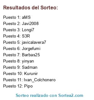 Lista de participantes: Jorgefumi, Ivan_Colchonero, Barbas25, Javi2008, javicalavera7, yinyan, Kurunir, Pipo, Longi7, Sadman, S3R, aMS.
