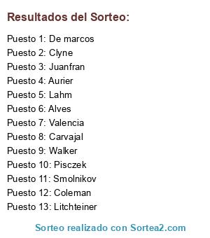 Lista de participantes: Lahm, Carvajal, Alves, Juanfran, Litchteiner, Pisczek, Aurier, Walker, Valencia, Clyne, Coleman, De marcos, Smolnikov.