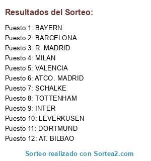 Lista de participantes: BAYERN, ATCO. MADRID, AT. BILBAO, INTER, R. MADRID, BARCELONA, LEVERKUSEN, TOTTENHAM, VALENCIA, SCHALKE, DORTMUND, MILAN.