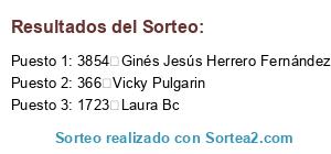 Lista de participantes: 1 Maria Francisca Garcia Calderon , 4 Cristina Lopez Moreno , 13 Mari Angeles Rodriguez Gay , 16 Rafael Beltran Liebanas , 17 Cristina Romera Peña , 19 Sonia Gutiérrez , 20 Marta Estrella , 21 Carmen Garcia Ruiz , 22 Angeles Moral Castro , 23 Macarena MA , 26 Marta López , 27 Rosa Camara Checa , 28 Josefina Martinez Alcantara , 29 Patricia Hidalgo , 30 Paloma Acero , 32 M Angeles Zoca , 34 Patrii Leiva , 38 Fran Rincón , 40 Belén Cano , 41 Puri Molina , 42 Irene Ortega Rubio , 44 Estefanía Buitrago , 45 Esperanza Fernández Luque , 46 Manuel Jesús Negrillo , 50 Helen Ángeles Zamora , 51 Paula Peña , 54 Almudena Soto , 56 Pedro J. Extremera , 57 Ana Muela Gallego , 61 Juan Miguel Moral Liebana , 63 Macarena Lorente Reyes , 66 Claudia Castillo Marchal , 67 Elena Pulido López , 68 Tania Caña , 71 Alex Gonzalez , 75 CarmenMaria Anievas Llavero , 77 Ana Mar , 83 Isabel Del Moral , 84 María Martos Martos , 86 Elena Casas Sanchez , 88 Ana Santiago Chica , 89 Bárbara Pérez García , 91 Angel Murgado Perez , 94 Arturo Rodríguez , 96 Ana Cano Alcantara , 97 Mari Paz Armenteros , 104 Jose Cabrera Gallardo , 106 Marimar Cruz , 110 Dioni Romo Garcia , 114 Fernandez Antonio , 119 Maria Bravo , 122 Ana Belen Lara Gomez , 123 Myriam Alcantara Castro , 125 Espe Huertas , 126 Montse Serrano , 127 Macarena García Sandalio , 129 Pili Liebana Blanca , 130 Noelia Fernandez , 131 Toni Jimenez Campiñas , 132 María Reo , 133 Maria Cruz Martinez , 135 Cristina Garrido Romera , 136 Mari Jesu Linde Liebana , 137 Angela Mercado Garrido , 138 Favi GiCar , 139 Bea Alba González , 140 Jesús Moral Álvarez , 142 Emy Navarrete Martinez , 143 Juan Antonio Granero Ortega , 145 Luis Romero , 146 Yolanda Ortega Ruiz , 147 Maria Jurado Jiménez , 148 Gema Exposito , 149 Mari Jose Rodriguez , 151 Almudena Muñoz Vicaria , 152 Sonia Pereira , 155 Maria Elena Barranco Luque , 159 Fatima Baena Aranda , 160 Angel Carrillo , 163 María Arroyo Antiñolo , 165 Manuel Utrera Garcia , 168 Ernesto Jiménez García , 169 Gema Erena Garcia , 171 María Martín Serrano , 174 Betina Caballero Blanco , 178 Domingo Valdivia , 183 Maialen Rey Pérez , 184 Carmen García Contreras , 185 Lucia Jimenez Perez , 187 Patrizia Zorrilla , 191 Maria José Jiménez Sánchez , 192 Zorayma Romero Garrido , 194 Verónica Villa García , 197 Mar Ruiz Melgarejo , 199 Miguel Escobosa Perez , 200 Rosana Cabrerizo , 204 Lourdes Galindo , 207 Maribel Muñoz , 208 Marta Simon , 211 Francisco Javier Pereira Cees , 212 Eduardo Soto Maya , 215 Patry Pérez , 216 Angel Fuentes Cegri , 217 Lucía Go , 223 Maiko Romero Anguita , 224 Francisco Ramirez Contreras , 226 María González Cabrera , 231 Sara Hernandez Ortega , 232 María Trigo Alcaraz , 233 Gloria Lara , 234 Mari Carmen López Gómez , 236 Emma Barranco Garrido , 237 Vanessa Martos Lopez , 238 Federico Lopez Torres , 239 Sara Peinado García , 240 Maria Del Carmen Gomez Baena , 245 Tere Gonzalez Martinez , 248 Sonia Amaro , 252 Mari Lola Castillo , 255 Elena Jimenez Tejada , 256 Miriam Ballesteros , 257 Juanma Torres Pulgar , 259 Maria Jose G R , 263 Sheyla Astasio , 264 Cristina Risueño Perales , 270 Gloria Nieto Sanchez , 271 Lucía Chica de la Torre , 272 Maria Martin Ruiz , 273 Juani Mora Muñoz , 277 Cristina Jiménez Moreno , 280 María Liébana , 281 Adriana Flores , 282 Maria De Los Angeles Cabrera Martínez , 283 Antonio Jesus Zucar Torres , 284 Ana Maria Martos Peinado , 285 Toy Anonimo , 286 Pilar Rayo Ramos , 288 Sandra Alcázar , 289 Manuel Lomas Sanchez , 290 Lucía Navas Caño , 296 Pili Aguilera , 297 Myriam Montes , 299 Lourdes LG , 301 Lourdes Valero Callejon , 304 Paqui Ordoñez Lopez , 305 Olga Pérez Fernandez , 307 Jose Carlos Martinez Cruz , 309 Luis Gonzalez , 314 Juan Jose Peinado Garrido , 315 Javi Solis Molero , 316 María José Megías Bolívar , 317 Irene Lopez Herrera , 318 Sonia Blanca ClubdeFans , 319 Carolina Clares Casas , 320 Fatima Maria Ariza , 321 Vane Sanchez , 322 Manuel Moral Rodríguez , 325 Mamen Liebana , 326 Saray Ortega Alvaro , 328 Juani Gomez Jimenez , 330 Sonia Martinez Heredia , 332 Isabel Justicia Garcia , 333 Juan Carlos CG , 334 Marta Montero Fernandez , 336 Fran Gonzalez Lopez , 337 Marta Nana , 341 Anabel Padilla Ortega , 342 Sonia Donaire Colmenero , 343 Juanma Vallejos , 344 Lorena Caballero Luque , 345 Carlos Pérez , 347 Lourdes Cuquii , 348 Rocio Martinez Liebana , 350 Maria Jesus Chus , 351 Maria Jose Ordoñez , 353 Lourdes Moreno Molina , 354 Alvaro Exposito Lopez , 355 Lola Peña , 356 Tere De la Torre , 357 Emi Martinez Alvarez , 358 J Enrique Jesús , 359 Javier Jimenez Narvaez , 360 Alberto Faia Recinrac , 363 Maria Anguita , 364 Maribel Arenas , 365 Miriam M Rs , 367 Juanjo Fer , 370 Xelo Melero Olivencia , 373 Gema Aguilar Fernandez , 374 Ana Garcia Santiago , 376 Antonia Escabias Jaenes , 377 Marta de Dios Guzmán , 378 Bea Bea , 379 Bernabe Diaz Exposito , 381 Mammen Cortés , 383 Ana Illana Gomez , 384 Sory Hinojosa , 385 Aurora Delgado Serrano , 387 Lorena Anguita , 389 Elena BarrioCon , 391 Marta López González , 394 Ana López León , 396 Rosa Perez , 398 Paula Zafra , 399 Cristina Liebana Perez , 400 Rafa Jaen , 401 Bárbara Jiménez , 403 Maria Hervas , 404 Marta Moreno Molina , 405 Carmen Maria Solis Molero , 406 Alberto Martínez Hervás , 407 Daniel P. Garrancho , 408 Gema Garcia Moral , 410 Mari Martos , 411 Raul López , 413 Maria Jose Cazalla Peinado , 414 Maria Jose Martinez Hervas , 417 Sara Bonilla Checa , 418 Tamara Collado Gallardo , 419 Maria López , 427 José Fernando Narváez Espejo , 431 Sandra Izquierdo , 434 Mercedes Diaz , 437 Nuria Gutierrez , 439 Elisabeth Torres , 440 Vero Delgado , 442 Maria Ballesta Lupion , 444 Inma Ruiz Garcia , 445 Manuel Martínez Chacón , 447 Maria Jesus Romero , 449 Maribel Serrano Colmenero , 450 Ángel Acl , 453 Marta Bermudez Tobias , 455 Carlos Ródenas , 457 Fernando Martinez Martinez , 458 MJ CazaGra , 459 Monica Cozar Garcia , 463 Vic