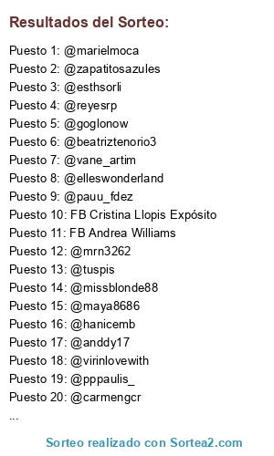 Lista de participantes: @missblonde88, @noe_ig_, @alicia_mg, @loredimu, FB Annanda Galvao, @sinetiquetar, FB Nerea Cabanas Gómez, @pppaulis_, @goglonow, @albinawer, @carmenzb, @alialvarezg, @loanis_88, @patrigpgm, @smallvermin, @mespe_, @pane1989, @mrn3262, @estelarriba, @miriammiras, @glororo, @stefgc, @anafisio21, @carolaincs, @ladywolff, @albarodrilo_, @zapatitosazules, FB Cristina Llopis Expósito, @albifm, @haridianlm, @reyesrp, FB Andrea Williams, @amandinax, @aliciavzarco, @anitanadalina, @tuspis, @maya8686, @carmengcr, @virinlovewith, @anddy17, @patrigf91, @mamorenosau, @lakarolaq, @vane_artim, @lilidix, @ladymaybellene, @beatriztenorio3, @elleswonderland, @pauu_fdez, @gracie_rdgz, @cristinav2, @hanicemb, @sushirosa6, FB Nerea González Cortina, @debmg_, @arantxa6100, @marielmoca, @silviitas, @esthsorli, @albamirasanchez, @untoquedecolor, @sonia_rubio_, FB Carla Mora.