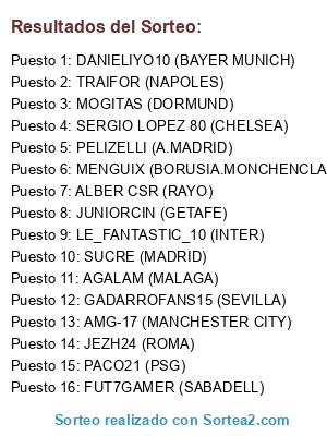 Lista de participantes: JUNIORCIN (GETAFE), SERGIO LOPEZ 80 (CHELSEA), LE_FANTASTIC_10 (INTER), TRAIFOR (NAPOLES), SUCRE (MADRID), FUT7GAMER (SABADELL), PACO21 (PSG), JEZH24 (ROMA), MOGITAS (DORMUND), ALBER CSR (RAYO), GADARROFANS15 (SEVILLA), PELIZELLI (A.MADRID), AMG-17 (MANCHESTER CITY), MENGUIX (BORUSIA.MONCHENCLADBACH), AGALAM (MALAGA), DANIELIYO10 (BAYER MUNICH).