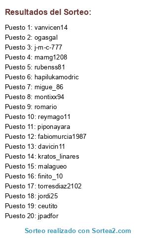 Lista de participantes: ogasgal, migue_86, kratos_linares, piponayara, j-m-c-777, malagueo, vanvicen14, davicin11, ceutito, finito_10, romario, rubenss81, fabiomurcia1987, jordi25, reymago11, montixx94, jpadfor, mamg1208, hapilukamodric, torresdiaz2102.