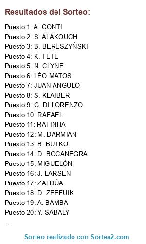Lista de participantes: JÚNIOR CAIÇARA, D. ZEEFUIK, A. BAMBA, V. LAZARO, N. CLYNE, M. LINNES, B. BUTKO, J. LARSEN, S. KLAIBER, D. BOCANEGRA, B. BERESZYŃSKI, Y. SABALY, A. CONTI, JUAN ANGULO, S. WIDMER, G. DI LORENZO, ZALDÚA, RAFINHA, M. DARMIAN, JUANFRAN, H. TRAORÉ, S. LAINER, RAFAEL, R. KARSDORP, S. PETROV, K. TETE, MIGUELÓN, S. ALAKOUCH, J. TAVERNIER, LÉO MATOS, G. MONTIEL.