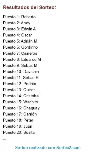Lista de participantes: Adrián M, Andy, Eduardo M, Quiroz, Carrión, Chelo, Cristóbal, Davichin, Pedrito, Edwin A, Gordinho, Juan, Ruls, Sebas R, Sosita, Wachito, Sebas M, Francisco Chang, Rendón, Chaguay, Cisneros, Roberto, Oscar, Peter.
