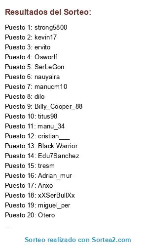 Lista de participantes: Adrian_ct1995, Osworlf, strong5800, Anxo, Otero, titus98, manucm10, cristian___, Serluis20_2, dilo , dilo , dilo , dilo , dilo , dilo , dilo , dilo , dilo , dilo , Adrian_mur, Black Warrior, thegameAJSD, miguel_per, pedroncillo, juanje, ervito, jemi666, kevin17, chusco83 , chusco83 , chusco83 , chusco83 , chusco83 , chusco83 , chusco83 , chusco83 , chusco83 , chusco83 , chusco83 , chusco83 , chusco83 , chusco83 , chusco83 , chusco83 , chusco83 , chusco83 , chusco83 , chusco83 , Billy_Cooper_88, manu_34, Esteve84, Edu7Sanchez, tresm, nauyaira, Eduardito, dailetc, xXSerBullXx, Sesan , Sesan , Sesan , Sesan , Sesan , Sesan , Sesan , Sesan , Sesan , Sesan , Sesan , Sesan , Sesan , Sesan , Sesan , Sesan , Sesan , Sesan , Sesan , Sesan , Sesan , Sesan , Sesan , Sesan , Sesan , Sesan , Sesan , Sesan , Sesan , Sesan , SerLeGon, treach.