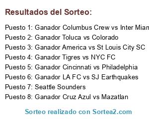 Lista de participantes: Seattle Sounders, Ganador Cincinnati vs Philadelphia, Ganador Columbus Crew vs Inter Miami, Ganador Cruz Azul vs Mazatlan, Ganador Tigres vs NYC FC, Ganador Toluca vs Colorado, Ganador LA FC vs SJ Earthquakes, Ganador America vs St Louis City SC.