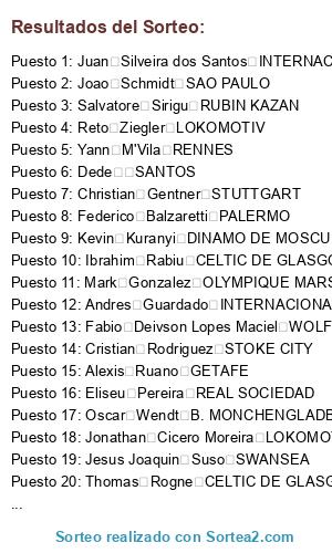 Lista de participantes: ATLÉTICO MADRID Diego Lopez, ATLÉTICO MADRID Artur Moraes, ATLÉTICO MADRID Arda Turan, ATLÉTICO MADRID Xherdan Shaqiri, ATLÉTICO MADRID Ander Herrera, ATLÉTICO MADRID Stephan El Shaarawy, ATLÉTICO MADRID Philippe Coutinho, ATLÉTICO MADRID Abou Diaby, ATLÉTICO MADRID Pablo Armero, ATLÉTICO MADRID Marcelo, ATLÉTICO MADRID Wellington Nem, ATLÉTICO MADRID Miroslav Stoch, ATLÉTICO MADRID Marko Arnautovic, ATLÉTICO MADRID Emilio Nsue, ATLÉTICO MADRID Laurent Koscielny, ATLÉTICO MADRID Bruno Ecuele Manga, ATLÉTICO MADRID Ezequiel Garay, ATLÉTICO MADRID Sergio Agüero, ATLÉTICO MADRID Demba Ba, ATLÉTICO MADRID Leroy Fer, ATLÉTICO MADRID Toby Alderweireld, ATLÉTICO MADRID B Mickey Van Der Hart, ATLÉTICO MADRID B Alphonse Areola, ATLÉTICO MADRID B Marco D'Alessandro, ATLÉTICO MADRID B Hayden White, ATLÉTICO MADRID B Leonardo Bittencourt, ATLÉTICO MADRID B Sergio Canales, ATLÉTICO MADRID B Levin Oztunali, ATLÉTICO MADRID B Lucas Torro, ATLÉTICO MADRID B Georgi Schennikov, ATLÉTICO MADRID B Pablo Sarabia, ATLÉTICO MADRID B Mateo Musacchio, ATLÉTICO MADRID B Terence Kongolo, ATLÉTICO MADRID B Mamadou Tounkara, ATLÉTICO MADRID B Momar N'Doye, ATLÉTICO MADRID B Mattia Destro, ATLÉTICO MADRID B Jonathan Dos Santos, ATLÉTICO MADRID B Harmeet Singh, ATLÉTICO MADRID B Ibrahima Conte, ATLÉTICO MADRID B Ignacio Camacho, Barcelona Simon Mignolet, Barcelona Stephane Ruffier, Barcelona Adan Lallana, Barcelona Julian Draxler, Barcelona Everton Ribeiro, Barcelona Gaston Ramirez, Barcelona Cristian Eriksen, Barcelona Rio Mavuba, Barcelona Yohan Cabaye, Barcelona Joao Moutinho, Barcelona Cristian Ansaldi, Barcelona Stefan Radu, Barcelona Marcos Luis Rocha Aquino, Barcelona Taison Barcellos Freda, Barcelona Willian Borges da silva, Barcelona N'koulou Ndouben, Barcelona Nicolas N'koulou, Barcelona Aymen Abdennour, Barcelona Gary Cahill, Barcelona Jo Alves de assis silva, Barcelona Diego Costa, Barcelona Wayne Rooney, Barcelona Oscar dos Santos, Baryern Leverkusen Victor Valdes, Baryern Leverkusen Diego Cavalieri, Baryern Leverkusen Ashley Young, Baryern Leverkusen Mesut Ozil, Baryern Leverkusen Claudio Marchisio, Baryern Leverkusen Tiago Cardoso Mendes, Baryern Leverkusen Mikel Arteta, Baryern Leverkusen Glen Johnson, Baryern Leverkusen Stephan Lichtsteiner, Baryern Leverkusen Ruben Garcia, Baryern Leverkusen Mohamed Salah, Baryern Leverkusen Zacaria Labyad, Baryern Leverkusen Andre Carrillo, Baryern Leverkusen Naldo, Baryern Leverkusen Aurelien Chedjou, Baryern Leverkusen Sokratis, Baryern Leverkusen Alexander Kokorin, Baryern Leverkusen Samuel Etoo, Baryern Leverkusen Wilfried Bony, Baryern Leverkusen Luis Muriel, Baryern Leverkusen Imoh Ezekiel, Baryern Leverkusen Jese Rodriguez, Bayern Munich Vicente Guaita, Bayern Munich Cristian Alvarez, Bayern Munich Lucas Moura Da Silva, Bayern Munich Mario Gotze, Bayern Munich Asier Illarramendi, Bayern Munich Bruno Soriano, Bayern Munich Koke, Bayern Munich Pablo Zabaleta, Bayern Munich Jordi Alba, Bayern Munich Cesar Azpilicueta, Bayern Munich Juan Mata, Bayern Munich Jonathan Pitroipa, Bayern Munich Javier Mascherano, Bayern Munich Jan Vertonghen, Bayern Munich Gerard Pique, Bayern Munich Iñigo Martinez, Bayern Munich Daniel Sturridge, Bayern Munich Karim Benzema, Bayern Munich Jose Salomon Rondon, Bayern Munich B Joel Robles, Bayern Munich B Jeronimo Rulli, Bayern Munich B Gerard Deulofeu, Bayern Munich B Federico Vico Villegas, Bayern Munich B Joel Matip, Bayern Munich B Oliver Torres, Bayern Munich B Alberto Moreno, Bayern Munich B Carles Planes, Bayern Munich B Hugo Mallo, Bayern Munich B Ola John, Bayern Munich B Adama Traore, Bayern Munich B Juan Bernat, Bayern Munich B Keita Balde diao, Bayern Munich B Stefan Savic, Bayern Munich B Kyriakos Papadopoulos, Bayern Munich B Frank Bagnack, Bayern Munich B Thievy Bifouma, Bayern Munich B Romarinho, Bayern Munich B Sergi Roberto, Bayern Munich B Kelvin Mateus, Betis Kevin Trapp, Betis Michel Vorm, Betis Ivan Perisic, Betis Marko Marin, Betis Alan Dzagoev, Betis Jose alberto Cañas, Betis Maxime Gonalons, Betis Beñat Etxebarria, Betis Leighton Baines, Betis Luke Shaw, Betis Martín Montoya, Betis Jesus Gamez, Betis Daniel Carvajal, Betis James Rodriguez, Betis Joaquin Sanchez, Betis Izet Hajrovic, Betis Daniel Agger, Betis Marc Bartra, Betis Bruno Alves, Betis Eliaquim Mangala, Betis Robin van Persie, Betis Ruben Castro, Betis Danny Welbeck, Betis B Pierrick Cros, Betis B Wojciech Pawlowski, Betis B Ezequiel Calvente, Betis B Álvaro Vadillo, Betis B Sergio Rodriguez, Betis B Alejandro Pozuelo, Betis B Luis Alberto, Betis B Gabriel Girotto Franco, Betis B jose antonio Nono, Betis B Geoffrey Kondogbia, Betis B James Ward_Prowse, Betis B Alex Martinez, Betis B Jon Aurtenetxe, Betis B Jon Flanagan, Betis B Loris Nery, Betis B Vitinho, Betis B Memphis Depay, Betis B Salvador Agra, Betis B Ahmed Musa, Betis B Matteo Bianchetti, Betis B Jorge Pulido, Betis B Mario Sampirisi, Betis B Tiago Ilori, Betis B Matheus Doria, Betis B Heung-Min Son, Boca Juniors Tim Krul, Boca Juniors Zoran Tosic, Boca Juniors Jefferson Farfan, Boca Juniors Camilo Zuñiga, Boca Juniors Sven Bender, Boca Juniors Moussa Dembele, Boca Juniors Antonio Candreva, Boca Juniors Mathieu Valbuena, Boca Juniors Nacho Monreal, Boca Juniors Jeremy Mathieu, Boca Juniors Andrés Guardado, Boca Juniors Oussama Assaidi, Boca Juniors David Villa, Boca Juniors Aaron Lennon, Boca Juniors Luis Perea, Boca Juniors Christipher Samba, Boca Juniors Younés Kaboul, Boca Juniors Alessandro Diamanti, Boca Juniors Obafemi Martins, Boca Juniors Kevin Mirallas, Boca Juniors Mauro Zarate, Boca Juniors Stefan Reinartz, Boca Juniors Ander Iturraspe, Boca Juniors Jefferson De Oliveira Galvao, Dortmund Ron-Robert Zieler, Dortmund Maarten Stekelenburg, Dortmund Rui Patricio, Dortmund Jesus Navas, Dortmund Jaineil Hoilett, Dortmund Gaucho Ronaldinho, Dortmund Michael Essien, Dortmund Cheik Tiote, Dortmund Marcel Schmelzer, Dor