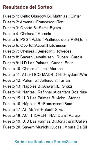 Lista de participantes: AC Milán Ivan Perisic, AC Milán Tim Krul, AC Milán Kevin Mirallas, AC Milán Bojan Krkic, AC Milán Fabricio Coloccini, AC Milán Cesar Azpilicueta, AC Milán Donis Avdijaj, AC Milán Mauro Zarate, AC Milán Younés Kaboul, AC Milán Jan Vertonghen, AC Milán Soldado, AC Milán Ashley Cole, AC Milán Andrés Guardado, AC Milán Sven Bender, AC Milán Asmir Begovic, AC Milán Nacho Monreal, AC Milán Nani, AC Milán Rafael Silva, AC Milán Kevin Volland, AC Milán Jeremy Mathieu, ACF FIORENTINA Kevin Strootman, ACF FIORENTINA Juan Bernat, ACF FIORENTINA Cristian Zapata, ACF FIORENTINA Aritz Aduriz, ACF FIORENTINA Claudio Bravo, ACF FIORENTINA Bernardo Espinosa, ACF FIORENTINA Leroy Fer, ACF FIORENTINA Heung-Min Son, ACF FIORENTINA Lora, ACF FIORENTINA Roberto Firmino, ACF FIORENTINA Franck Ribery, ACF FIORENTINA Roman Burki, ACF FIORENTINA Naldo, ACF FIORENTINA Thiago Motta, ACF FIORENTINA Dani Parejo, ACF FIORENTINA Luciano Vietto(cedido a la Fiore Temp XII), ACF FIORENTINA Danilo, ACF FIORENTINA Aymeric Laporte, ACF FIORENTINA Maxime Gonalons, ACF FIORENTINA José Callejón, ACF FIORENTINA Mario Mandzukic, ACF FIORENTINA Aleix Vidal, ACF FIORENTINA Alexandre Lacazette, ACF FIORENTINA B Jorge Mere Perez, ACF FIORENTINA B Pablo Perez, ACF FIORENTINA B Gabriel Castellon, ACF FIORENTINA B Borja Lopez, ACF FIORENTINA B Eric Bertrand Bailly(cedido a la Fiore B,Temp XII), ACF FIORENTINA B Frederik Sorensen, ACF FIORENTINA B Godfred Donsah, ACF FIORENTINA B Pedro Obiang, ACF FIORENTINA B Iuri Medeiros, ACF FIORENTINA B Anthony Martial, ACF FIORENTINA B Dani Ndi, ACF FIORENTINA B Yossuf Poulsen, ACF FIORENTINA B Timo Horn, ACF FIORENTINA B Jonathan Tah, ACF FIORENTINA B Juan Muñiz, ACF FIORENTINA B Carlos Castro, ACF FIORENTINA B Fraser Kerr, ACF FIORENTINA B Alex Serrano, ACF FIORENTINA B Lass Bangoura, Arsenal Eliseu Pereira, Arsenal Daniel Agger, Arsenal Branislav Ivanovic, Arsenal Ricardo Quaresma, Arsenal Carlos Peña, Arsenal Aurelien Chedjou, Arsenal Nedum Onuoha, Arsenal Mohamed Salah, Arsenal Mubarak Wakaso, Arsenal Gianluigi Buffon, Arsenal Francesco Totti, Arsenal Didier Drogba, Arsenal Taison Barcellos Freda, Arsenal Mathieu Valbuena, Arsenal Rodrigo Palacio, Arsenal Marco Parolo, Arsenal Carlos Tevez, Arsenal Wesley Sneijder, Arsenal Felipe Melo, Arsenal Sergio Canales, Arsenal Oscar De Marcos, Arsenal Andre Ayew, Arsenal Rene Adler, Arsenal Christian Abbiati, ATLÉTICO MADRID Thomas Muller, ATLÉTICO MADRID Konstantine Rausch, ATLÉTICO MADRID Jonathan Dos Santos, ATLÉTICO MADRID Marcel Schmelzer, ATLÉTICO MADRID Nabil Fekir, ATLÉTICO MADRID Laurent Koscielny, ATLÉTICO MADRID Derick Tshimanga, ATLÉTICO MADRID Edinson Cavani(cedido al ATM temp XII), ATLÉTICO MADRID Xabi Alonso, ATLÉTICO MADRID Wellington Silva, ATLÉTICO MADRID Alex Rodrigo Diaz da Costa, ATLÉTICO MADRID Karlsson Per, ATLÉTICO MADRID Tiago Cardoso Mendes, ATLÉTICO MADRID Jesus Corona, ATLÉTICO MADRID Philippe Coutinho, ATLÉTICO MADRID Aaron Ramsey, ATLÉTICO MADRID Thibaut Courtois, ATLÉTICO MADRID Arda Turan, ATLÉTICO MADRID Gervinho Yao, ATLÉTICO MADRID Fernando Torres, ATLÉTICO MADRID Vicente Guaita, ATLÉTICO MADRID Jose Manuel Fernandez, ATLÉTICO MADRID B Mickey Van Der Hart, ATLÉTICO MADRID B Momar N'Doye, ATLÉTICO MADRID B Hayden White, ATLÉTICO MADRID B Mamadou Tounkara, BARCELONA Ahmed Hassan, BARCELONA Carlos Vela, BARCELONA Jesus Gamez, BARCELONA Gary Cahill, BARCELONA Angel Di Maria, BARCELONA Simon Mignolet, BARCELONA Cristian Ansaldi, BARCELONA Konstantinos Manolas, BARCELONA Luis Suarez, BARCELONA Toni Kroos, BARCELONA Nicolas Gaitan, BARCELONA Aymen Abdennour, BARCELONA Yohan Cabaye, BARCELONA Cristian Eriksen, BARCELONA Carlos Darwin Quintero, BARCELONA Nicolas N'koulou, BARCELONA Granit Xhaka, BARCELONA Nathaniel Clyne, BARCELONA Stephane Ruffier, BARCELONA B Pione Sisto, BARCELONA B Marcos Lopes, BARCELONA B Jordan Lukaku, BARCELONA B Diego Reyes, BARCELONA B Horrit Hendrix, BARCELONA B Luis Gil, BARCELONA B Calum Chambers, BARCELONA B Adrien Rabiot, BARCELONA B Stefano Denswil, BARCELONA B Jesse Lingard, BARCELONA B Adnan Januzaj, BARCELONA B Nathan Redmond, BARCELONA B Joshua Kimmich, BARCELONA B Chuba Akpom, BARCELONA B Thorgan Hazard, BARCELONA B Josef Martinez, BARCELONA B Seko Fofana, BARCELONA B Youri Tielemans, BARCELONA B Raphael Guerreiro, BARCELONA B Julian Weigl, BARCELONA B Mory Kone, BARCELONA B Nicola Leali, BARCELONA B Mitchell Weiser, Bayern Leverkusen Victor Valdes, Bayern Leverkusen Arturo Vidal, Bayern Leverkusen Zacaria Labyad, Bayern Leverkusen Henrikh Mkhitaryan, Bayern Leverkusen Shinji Kagawa, Bayern Leverkusen Juan Manuel Mata, Bayern Leverkusen Alessio Cerci, Bayern Leverkusen Glen Johnson, Bayern Leverkusen Giuseppe Rossi, Bayern Leverkusen Joao Moutinho, Bayern Leverkusen Antonio Valencia, Bayern Leverkusen Marvell Wynne, Bayern Leverkusen Miguel Layun(cedido al Leverkusen ,Temp XII), Bayern Leverkusen Ruben Garcia, Bayern Leverkusen Tolga Zengin, Bayern Leverkusen Danny, Bayern Leverkusen Rasmus Elm(cedido al Leverkusen Temp XII), Bayern Leverkusen Gonzalo Castro, Bayern Leverkusen Jerry Akaminko, Bayern Munich Lucas Moura Da Silva, Bayern Munich Ali Ahamada, Bayern Munich Gerard Deulofeu, Bayern Munich Ola John, Bayern Munich Javier Mascherano, Bayern Munich Talisca, Bayern Munich Diego Costa, Bayern Munich Pablo Zabaleta, Bayern Munich Mario Gotze, Bayern Munich Alexis Sánchez, Bayern Munich David De Gea, Bayern Munich Joel Matip, Bayern Munich Koke, Bayern Munich Alberto Moreno, Bayern Munich Keita Balde diao, Bayern Munich Stefan Savic, Bayern Munich Maarten Stekelenburg, Bayern Munich Gerard Pique, Bayern Munich Samuel Etoo, Bayern Munich Gaucho Ronaldinho, Bayern Munich Jordi Alba, Bayern Munich Bernard Anicio(cedido al Bayern Temp XII), Bayern Munich B Ruben Vezo, Bayern Munich B Bruno Zuculini, Bayern Munich B Denis Suarez, Bayern Munich B Jean Marie Dongou, Bayern Munich B Frank Bagnack, Bayern Munich B Antonio