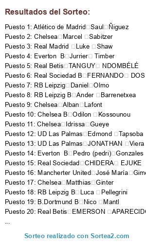 Lista de participantes: Chelsea Miguel Moyá, Chelsea Joao Moutinho, Chelsea Fabian Castillo, Chelsea Yannick Ferreira Carrasco, Chelsea Matthias Ginter, Chelsea Zlatko Junuzovic, Chelsea Idrissa Gueye, Chelsea Antonio Latorre, Chelsea Alex Oxlade-Chamberlain, Chelsea Angello Stiller, Chelsea Rubén Sobrino, Chelsea Miranda, Chelsea Bernd Leno, Chelsea Arthur Masuaku, Chelsea Ander Capa, Chelsea Martín Montoya, Chelsea Cristian Portugués, Chelsea Quincy Promes, Chelsea Marcel Sabitzer, Chelsea Georgiy Dzhikiya Dzhikiya, Chelsea Jason Denayer, Chelsea Henry Onyekuru, Chelsea Wissam Ben Yedder, Chelsea Ryan Fredericks, Chelsea Alban Lafont, Chelsea B Brenden Aaronson, Chelsea B Tomas Tavarés, Chelsea B Marcel Ruiz, Chelsea B Lutsharel Geertruida, Chelsea B Khephren Thuram, Chelsea B Yacine Adli, Chelsea B Joelson Fernandes, Chelsea B Angel Fortuño, Chelsea B Filip Jorgensen, Chelsea B Marley Ake, Chelsea B Alhassan Yusuf, Chelsea B guilherme pato, Chelsea B Nathan Ferguson, Chelsea B Iker losada, Chelsea B Ismael Casas, Chelsea B Jonathan Panzo, Chelsea B Michael Olise, Chelsea B Odilon Kossounou, Chelsea B Emin Bayram, Chelsea B Kevin Boma, Chelsea B Benjamin Sesko, Chelsea B Noah Okafor, Chelsea B Million Manhoef, Chelsea B Bartlomiej Mruk, Chelsea B Largie Ramazani, Atlético de Madrid Allan Saint-Maximim, Atlético de Madrid Renato Sanches, Atlético de Madrid Tyronne Ebuehi, Atlético de Madrid Mikel Oyarzabal, Atlético de Madrid Rick Karsdorp, Atlético de Madrid Tyler Adams, Atlético de Madrid dane scarlett, Atlético de Madrid Bruno Fernandes, Atlético de Madrid Tomas Lemar, Atlético de Madrid Ramy Bensebaini, Atlético de Madrid Gerard Deulofeu, Atlético de Madrid Saul Ñiguez, Atlético de Madrid Sergio Ramos, Atlético de Madrid Anthony Martial, Atlético de Madrid Clement Lenglet, Atlético de Madrid Sergio Reguilón, Atlético de Madrid RAPHAEL GUERREIRO, Atlético de Madrid Marcus Rashford, Atlético de Madrid Thibaut Courtois, Atlético de Madrid Kevin Trapp, Atlético de Madrid Yves Bissouma, Atlético de Madrid joao felix, Atlético de Madrid Romelu Lukaku, Atlético de Madrid daniel podence, Atlético de Madrid B luis sinisterra, Atlético de Madrid B Emile Smith Rowe, Atlético de Madrid B Pedro De la Vega, Atlético de Madrid B Sekou koita, Atlético de Madrid B maarten vandevoordt, Atlético de Madrid B Ronaldo Vieira, Atlético de Madrid B Sergio Camello, Atlético de Madrid B Mitchell van Bergen, Atlético de Madrid B Christian Früchtl, Atlético de Madrid B Blas Riveros, Atlético de Madrid B Charles De Ketelaere, Atlético de Madrid B Kristoffer Ajer, Atlético de Madrid B Iñigo Córdoba, Atlético de Madrid B Marcus Tavernier, Atlético de Madrid B Timothy Weah, Atlético de Madrid B Perr Schuurs, Atlético de Madrid B Victor Mollejo, Atlético de Madrid B liam dalap, Atlético de Madrid B Jeremy Doku, Atlético de Madrid B mohammed kudus, Atlético de Madrid B Jonathan Amon, Atlético de Madrid B chris richards, Atlético de Madrid B Devyne Rensch, Atlético de Madrid B morgan gibbs-white, Bayer Leverkusen Everton Soares, Bayer Leverkusen Josip Illicic, Bayer Leverkusen Alexander Kolarov, Bayer Leverkusen Djene Dakoman, Bayer Leverkusen Marcos Acuña, Bayer Leverkusen Federico (Fred) Rodrguez, Bayer Leverkusen Radja Nainggolan, Bayer Leverkusen Sergio Canales, Bayer Leverkusen ROBIN GOSENS, Bayer Leverkusen Jesus Corona, Bayer Leverkusen Samir Handanovic, Bayer Leverkusen Antonio Adan, Bayer Leverkusen Íker Muniain, Bayer Leverkusen Hector Herrera, Bayer Leverkusen Oscar do Santos, Bayer Leverkusen Iago Aspas, Bayer Leverkusen Ciro Immobile, Bayer Leverkusen Nicolás Alejandro Tagliafico, Bayer Leverkusen Edin Visca, Real Sociedad IVAN RAKITIC, Real Sociedad Gareth Bale, Real Sociedad Filip Kostic, Real Sociedad Fran Echeampong, Real Sociedad FELIPE ANDERSON, Real Sociedad ALEX SANDRO, Real Sociedad Alex Teixeira, Real Sociedad Mário Figueira Fernandes, Real Sociedad NICOLAS DE LA CRUZ ARCOSA, Real Sociedad Marco Reus, Real Sociedad Yan Sommer, Real Sociedad FRANK ONYEKA, Real Sociedad José Paulo Paulinho, Real Sociedad GOZALO MONTIEL, Real Sociedad JORDAN LUKAKU, Real Sociedad Falaye Sacko, Real Sociedad Frank Fabra, Real Sociedad Aaron Wan-Bissaka, Real Sociedad Ederson Santana de Moraes, Real Sociedad CHIDERA EJUKE, Real Sociedad JEREMIAH ST.JUSTE, Real Sociedad Sergio Agüero, Real Sociedad RIDLE BOTE BAKU, Real Sociedad VIKTOR KOVALENKO, Real Sociedad ALBERT BRAUT TJALAND, Real Sociedad B Markus Schubert, Real Sociedad B Gaëtan Poussin , Real Sociedad B TYLER MAGLOIRE, Real Sociedad B Lloyd Kelly, Real Sociedad B NAHUEL BUSTOS, Real Sociedad B MAURO JUNIOR, Real Sociedad B Ezri Konsa, Real Sociedad B Uros Racic, Real Sociedad B VLADYSLAV SUPRIAHA, Real Sociedad B Kevin Ruegg, Real Sociedad B ERIC GARCIA, Real Sociedad B DANIEL MALDINI, Real Sociedad B Crysencio SUMMERVILLE, Real Sociedad B IGNACIO ALISEDA, Real Sociedad B Luther Singh, Real Sociedad B Samuel Chukwueze, Real Sociedad B KONRAD DE LA FUENTE, Real Sociedad B GEORGIY TSITAISHVILI, Real Sociedad B CHISTIAN CONTEH, Real Sociedad B FERNANDO DOS SANTOS, Real Sociedad B ARVIN APPIAH, Real Sociedad B LEIF DAVIS, B.Dortmund Leon Bailey, B.Dortmund Matt Hummels, B.Dortmund Kylian Mbappe Lottin, B.Dortmund Alexander Isak, B.Dortmund Daniel Carvajal, B.Dortmund Jiri Pavlenka, B.Dortmund Pau Torres, B.Dortmund Paul Pogba, B.Dortmund Mario Gotze, B.Dortmund Axel Witsel, B.Dortmund Marek Hamsik, B.Dortmund Buffon, B.Dortmund Frank Ribery, B.Dortmund Hirving Lozano, B.Dortmund Sofyan Amrabat, B.Dortmund Karim Bellarabi, B.Dortmund Marquinhos, B.Dortmund Zlatan Ibrahimovic, B.Dortmund Yuri Berchiche, B.Dortmund Phil Foden, B.Dortmund B Sergio Gomez, B.Dortmund B Sofiane Diop, B.Dortmund B Lautaro Morales, B.Dortmund B Alan Velasco, B.Dortmund B Josep Martinez, B.Dortmund B Dujon Sterling, B.Dortmund B Enzo Millot, B.Dortmund B Roberto Piccoli, B.Dortmund B Sebastiano Esposito, B.Dortmund B Gonzal