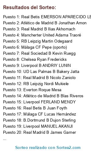 Lista de participantes: Daniel James, NOAH OKAFOR, Fran García, ANDRE-FRANC ZAMBO ANGUISSA, DANIEL SANTOS BRAGANÇA, Cedric Bakambu, Carlos Neva Tey, JEREMIAH ST.JUSTE, JOĀO PEDRO (JOTA) NEVES FILIPE (JOTA), SAIDY JANKO, ALPHA DIONKOU, KENAN YILDIZ, IVAN SANCHEZ, KEVIN DE BRUYNE, LUKA ROMERO, JUANDA FUENTES, Tomáš Vaclík, Lucas Gastón Robertone, Nabil Fekir, AXEL TUANZEBE, EDUARDO SALVIO, Willfred Ndidi, Pepe (oporto), Barcelona B ISSA KABORÉ, Barcelona B KONTASTINOS TZOLAKIS, Barcelona B RIDVAN YILMAZ, Barcelona B adam karabec, Barcelona B Alessandro Burlamaqui, Barcelona B FABIO CARVALHO, Barcelona B Nnamdi Collins, Barcelona B Bryan Okoh, Barcelona B Octavian George Popescu, Barcelona B Ernest Poku, Barcelona B KARIM ADEYEMI, Barcelona B NICOLO ROVELLA, Barcelona B omar el hilali, Barcelona B MARCO EHMANN, Barcelona B ALEXANDRU MUSI, Barcelona B MOHAMED TOURE, Barcelona B ADOYEJI SOTONA, Barcelona B Charis Chatzigavriel, Barcelona B Alfie Devine, Barcelona B Rav van den Berg, Barcelona B Alexios Kalogeropoulos, Barcelona B ANTWOINE HACKFORD, Barcelona B YIRA SOR, Chelsea Boulaye Dia, Chelsea Riechedly Bazoer, Chelsea Michael Amir Murillo Bermudez, Chelsea Damián Suárez, Chelsea Armindo (BRUMA) Tué Na Bangna, Chelsea Petr Sevcik, Chelsea Yunis Abdelhamid, Chelsea Adem Ljajić, Chelsea Marcelo Vieira da Silva Júnior, Chelsea Amath Ndiaye, Chelsea Adrián Andrés Cubas, Chelsea Marcus Edwards, Chelsea Yuri Berchiche, Chelsea Éver Banega, Chelsea Javier Puado Díaz, Chelsea Anthony Nwakaeme, Chelsea André Martín Carrillo Díaz, Chelsea Yan Sommer, Chelsea Jiri Pavlenka, Chelsea LEONARDO BONUCCI, Chelsea Arturo Vidal, Chelsea IVAN RAKITIC, Chelsea Darwin Machis, Chelsea JONATHAN Viera, Chelsea MARIO HERMOSO, Atlético de Madrid Allan Saint-Maximim, Atlético de Madrid Renato Sanches, Atlético de Madrid Tyronne Ebuehi, Atlético de Madrid Mikel Oyarzabal, Atlético de Madrid Rick Karsdorp, Atlético de Madrid thiago silva, Atlético de Madrid Iñigo Córdoba, Atlético de Madrid EZRI KONSA, Atlético de Madrid daniel podence, Atlético de Madrid Leroy Sane, Atlético de Madrid ben godfrey, Atlético de Madrid alexander hartmann bah, Atlético de Madrid Sergio Ramos, Atlético de Madrid Thomas Muller, Atlético de Madrid LAUTARO MARTINEZ, Atlético de Madrid N´GOLO KANTE, Atlético de Madrid RAPHAEL GUERREIRO, Atlético de Madrid Marcus Rashford, Atlético de Madrid Thibaut Courtois, Atlético de Madrid Kevin Trapp, Atlético de Madrid Yves Bissouma, Atlético de Madrid Emile Smith Rowe, Atlético de Madrid luis sinisterra, Atlético de Madrid NEYMAR JUNIOR, Atlético de Madrid CODY GAKPO, Atlético de Madrid B chris richards, Atlético de Madrid B Devyne Rensch, Atlético de Madrid B Pedro De la Vega, Atlético de Madrid B Jonathan Amon, Atlético de Madrid B maarten vandevoordt, Atlético de Madrid B Ronaldo Vieira, Atlético de Madrid B ANTHONY ELANGA, Atlético de Madrid B Mitchell van Bergen, Atlético de Madrid B Christian Früchtl, Atlético de Madrid B Blas Riveros, Atlético de Madrid B shola shoretire, Atlético de Madrid B Kristoffer Ajer, Atlético de Madrid B dane scarlett, Atlético de Madrid B Marcus Tavernier, Atlético de Madrid B Timothy Weah, Atlético de Madrid B Perr Schuurs, Atlético de Madrid B Victor Mollejo, Atlético de Madrid B liam delap, Atlético de Madrid B Jeremy Doku, Atlético de Madrid B mohammed kudus, Atlético de Madrid B FRANCISCO CONCEICAO, Atlético de Madrid B FESTY EBOSELE, Atlético de Madrid B GIALUCA BUSIO, Atlético de Madrid B VITINHA, Atletico de Madrid B FABIO VIEIRA, Bayer Leverkusen Kerian Trippier, Bayer Leverkusen Steven Berghuis, Bayer Leverkusen Edin Visca, Bayer Leverkusen Cristian Romero, Bayer Leverkusen Marcos Acuña, Bayer Leverkusen Federico (Fred) Rodrguez, Bayer Leverkusen Giovanni Lo Celso, Bayer Leverkusen Thiago Alcantara, Bayer Leverkusen Gerard Moreno, Bayer Leverkusen Ben Yedder, Bayer Leverkusen Samir Handanovic, Bayer Leverkusen Antonio Adan, Bayer Leverkusen Íker Muniain, Bayer Leverkusen Ciro Immobile, Bayer Leverkusen Oscar do Santos, Bayer Leverkusen Iago Aspas, Bayer Leverkusen MANUEL AKANJI, Bayer Leverkusen Adan Januzaj, Manchester United JASON DENAYER, Manchester United Gareth Bale, Manchester United Filip Kostic, Manchester United GEORGES KEVIN NKOUDOU, Manchester United FELIPE ANDERSON, Manchester United ALEX SANDRO, Manchester United DOMINIK LIVAKOVIC, Manchester United Mário Figueira Fernandes, Manchester United NICOLAS DE LA CRUZ ARCOSA, Manchester United Marco Reus, Manchester United MARCEL SABITZER, Manchester United FRANK ONYEKA, Manchester United Uros Racic, Manchester United GONZALO MONTIEL, Manchester United Dries Mertens, Manchester United KIERAN TIERNEY, Manchester United Ante Rebic, Manchester United Clement Lenglet, Manchester United Ederson Santana de Moraes, Manchester United CHIDERA EJUKE, Manchester United AURÉLIO BUTA, Manchester United ROBERTO FIRMINO, Manchester United Wenderson GALENO, Manchester United GEORGIY DZHIKIYA, Manchester United THORGAN HAZARD, Manchester United B CHISTIAN CONTEH, Manchester United B ISMAEL CASAS, Manchester United B MIKKEL DAMSGAARD, Manchester United B ERSIN DESTANOGLU, Manchester United B ARVIN APPIAH, Manchester United B MAURO JUNIOR, Manchester United B KONRAD DE LA FUENTE, Manchester United B Alhassan Yusuf Abdullahi, Manchester United B VLADYSLAV SUPRIAHA, Manchester United B IGNACIO ALISEDA, Manchester United B ERIC GARCIA, Manchester United B NOAH KATTERBACH, Manchester United B ETHAN LAIRD, Manchester United B NICO GONZALEZ, Manchester United B DOGAN ALEMDAR, Manchester United B ALIOU BALDE, Manchester United B YORBE VERTESSEN, Manchester United B JAYDEN OOSTERWOLDE, Manchester United B MICHAEL OLISE, Manchester United B JACK LAHNE, Manchester United B MYKHAYLO MUDRYK, Manchester United B BRENNAN JOHNSON, Manchester United B PETER GONZALEZ, Manchester United B TOMMY ST. JAGO, B.Dortmund Sergio Reguilon, B.Dortmund Matt Hummels, B.Dort