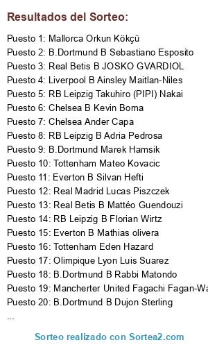 Lista de participantes: Barcelona Noah Darvich, Barcelona JONATHAN TAH, Barcelona FEDERICO GATTI, Barcelona Marcos (MARQUINHOS) OLMO, Barcelona GABRIEL MARTINELLI, Barcelona FRENKIE DE JONG, Barcelona NOAH OKAFOR, Barcelona ANTONEE ROBINSON, Barcelona JOAO CANCELO, Barcelona Martin Odegaard, Barcelona FRANCESCO CAMARDA, Barcelona Ousmane Dembele, Barcelona Ferdi Erenay Kadıoğlu, Barcelona JUNIOR LUKEBA, Barcelona UNAI SIMON, Barcelona ANTOINE GRIEZMANN, Barcelona MIKA MARMOL, Barcelona ALEX REMIRO, Barcelona Raphael (Raphinha) Dias Belloli, Barcelona NICOLO ROVELLA, Barcelona JOAO FELIX, Barcelona Jules Kounde, Barcelona MARIO GILA FUENTES, Barcelona B Marc Bernal, Barcelona B NIKLAS HEDL, Barcelona B MIKAYIL FAYE, Barcelona B YASER ASPRILLA MARTINEZ, Barcelona B TYRIQUE GEORGE, Barcelona B MARC CASADO, Barcelona B Nnamdi Collins, Barcelona B Bryan Okoh, Barcelona B JULIAN HETTWER, Barcelona B PAU VICTOR, Barcelona B ETHAN NWANERI, Barcelona B KENAN YILDIZ, Barcelona B omar el hilali, Barcelona B PABLO TORRE, Barcelona B SANTIAGO LOPEZ GROBIN, Barcelona B Stefanos Tzimas, Barcelona B Radu Drăgușin, Barcelona B MAXIMO PERRONE, Barcelona B RENATO MARIN, Barcelona B ALEX VALLE, Barcelona B Arnau Tenas, Barcelona B GERARD MARTIN, FC Bayern Munchen Denzel Justus Morris Dumfries, FC Bayern Munchen Gleison bremer, FC Bayern Munchen Leon Goreztka, FC Bayern Munchen Manuel Neuer, FC Bayern Munchen Sávio Moreira de Oliveira, FC Bayern Munchen Rico Lewis, FC Bayern Munchen David Raum, FC Bayern Munchen Lorenzo Pellegrini, FC Bayern Munchen Joshua Kimmich, FC Bayern Munchen Virgil Van Dijk, FC Bayern Munchen Ángel Di María, FC Bayern Munchen Federico Chiesa, FC Bayern Munchen Leroy Aziz Sané, FC Bayern Munchen Désiré Doué, FC Bayern Munchen Yan Sommer, FC Bayern Munchen Éderson José dos Santos, FC Bayern Munchen Ruben Loftus-Cheek, FC Bayern Munchen LIONEL MESSI, FC Bayern Munchen Jeremias Israel St. Juste, FC Bayern Munchen DESTINY UDOGIE, FC Bayern Munchen Estêvão Willian Almeida de Oliveira, FC Bayern Munchen Riyad Mahrez, FC Bayern Munchen Kalidou Koulibaly, FC Bayern Munchen Ademola Lookman, FC Bayern Munchen Ángel Martín Correa, Bayern Munchen B Saël Kumbedi, Bayern Munchen B Claudio Echeverri, Bayern Munchen B Federico Redondo, Bayern Munchen B Exequiel Zeballos, Bayern Munchen B Sverre Nypan, Bayern Munchen B Gianluca Prestianni, Bayern Munchen B Ernest Nuamah, Bayern Munchen B Kees Smit, Bayern Munchen B Callum Doyle, Bayern Munchen B Alberto Oliveira Baio (alberto Costa), Bayern Munchen B Samson Baidoo, Bayern Munchen B James Trafford, Bayern Munchen B Eli Junior Kroupi, Bayern Munchen B Mio Backhaus, Bayern Munchen B Malick fofana, Bayern Munchen B Lamine camara, Bayern Munchen B Arthur Vermeeren, Bayern Munchen B Luka Vuskovic, Bayern Munchen B Rodrigo Mora, Bayern Munchen B Kendry Páez, Bayern Munchen B Patrick Dorgu, Bayern Munchen B Can Uzun, Bayern Munchen B Jorrel Hato, Bayern Munchen B Yasin Özcan, Bayern Munchen B Abdulai Jumas Bah, Atlético de Madrid Lutsharel Geertruida, Atlético de Madrid Jeremy Doku, Atlético de Madrid Tyronne Ebuehi, Atlético de Madrid Vítor (VITINHA) Machado Ferreira, Atlético de Madrid ALEJANDRO GARNACHO, Atlético de Madrid KARIM ADEYEMI, Atlético de Madrid BRENNAN JOHNSON, Atlético de Madrid Thierry Correia, Atlético de Madrid kevin danso, Atlético de Madrid JULIAN ALVAREZ, Atlético de Madrid Timothy Weah, Atlético de Madrid WARREM ZAÏRE EMERY, Atlético de Madrid WILFRIED STEPHANE SINGO, Atlético de Madrid Jadon Sancho, Atlético de Madrid MOHAMED KUDUS, Atlético de Madrid luis sinisterra, Atlético de Madrid Cole Palmer, Atlético de Madrid Felix Kalu mmecha, Atlético de Madrid Gregor Kobel, Atlético de Madrid GIORGIO SCALVINI, Atlético de Madrid FRANCISCO CONCEICAO, Atlético de Madrid MATHYS TEL, Atlético de Madrid Bart Verbruggen, Atlético de Madrid KONSTANTINOS KOULIERAKIS, Atlético de Madrid B James Beadle, Atlético de Madrid B Devyne Rensch, Atlético de Madrid B MIKA GODTS, Atlético de Madrid B Tiago Morais, Atlético de Madrid B Alejo Véliz, Atlético de Madrid B Matias Fernandez-Pardo, Atlético de Madrid B Elias Jelert Kristensen, Atlético de Madrid B Ernest Poku, Atlético de Madrid B FABIO MIRETTI, Atlético de Madrid B carlos forbs, Atlético de Madrid B Matteo Prati, Atlético de Madrid B ROGER FERNANDES, Atlético de Madrid B RENATO VIEGA, Atlético de Madrid B maarten vandevoordt, Atlético de Madrid B MATEUS FERNANDES, Atlético de Madrid B LUCA WARRICK KOLEOSHO, Atlético de Madrid B Tygo Land, Atlético de Madrid B Alejandro Francés, Atlético de Madrid B KRISTIAN HLYNSSON, Atlético de Madrid B YANKUBA MINTEH, Atlético de Madrid B FORSON AMANKWAH, Atlético de Madrid B FESTY EBOSELE, Atlético de Madrid B SILVANO VOS, Atlético de Madrid B Matheus França de Oliveira, Bayer Leverkusen Kerian Trippier, Bayer Leverkusen Yuossef En-Nesiry, Bayer Leverkusen Michael Olise, Bayer Leverkusen Cristian Romero, Bayer Leverkusen Marcos Acuña, Bayer Leverkusen David Hancko, Bayer Leverkusen Manuel Akanji, Bayer Leverkusen Davide Frattesi, Bayer Leverkusen Gerard Moreno, Bayer Leverkusen Israel Reyes, Bayer Leverkusen Hugo Lloris, Bayer Leverkusen Pedro Goncalvez, Bayer Leverkusen Damian Emiliano Martínez, Bayer Leverkusen Ciro Immobile, Bayer Leverkusen Orkun Kokcu, Bayer Leverkusen Iago Aspas, Bayer Leverkusen Mattia Zaccagni, Bayer Leverkusen Domenico Berardi, Bayer Leverkusen KONRAD LAIMER, Bayer Leverkusen Federico Dimarco, Galatasaray lucas torreira, Galatasaray YORBE VERTESSEN, Galatasaray Filip Kostic, Galatasaray GEORGES KEVIN NKOUDOU, Galatasaray Renato Sanches, Galatasaray Juan Camilo Hernandez, Galatasaray Paulo Dino Gazzaniga Farias, Galatasaray sergiño dest, Galatasaray Joe Gomez, Galatasaray BRIAN BROBBEY, Galatasaray serge david Gnabry, Galatasaray David alaba, Galatasaray Heung-min Son, Galatasaray Pablo Maffeo, Galatasaray Yann Aurel Ludger Bisseck, Galatasaray Edon Zhegrova, Gal