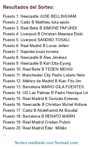 Lista de participantes: Barcelona FRENKIE DE JONG, Barcelona JONATHAN TAH, Barcelona Rafael Leao, Barcelona Marcos (MARQUINHOS) Aoás Corrêa, Barcelona Joan García Pons, Barcelona ARDA GULER, Barcelona ALEJANDRO BALDE, Barcelona FERMIN LOPEZ MARIN, Barcelona JEREMY JACQUET, Barcelona HAMZA ABDELKARIM, Barcelona Erling Braut Haaland, Barcelona Micky van de Ven, Barcelona NICO O´REILLY, Barcelona JOSHUA KIMMICH, Barcelona Gabriel martinelli, Barcelona MARC CASADO, Barcelona PHIL FODEN, Barcelona GIANLUIGI DONNARUMMA, Barcelona MAMADOU SANGARE, Barcelona EBRIMA TOUNKARA, Barcelona NICOLAS PÉPÉ, Barcelona Jules Kounde, Barcelona MARIO GILA FUENTES, Barcelona Ibraima Konate, Barcelona RUAN PABLO, Barcelona B Marc Bernal, Barcelona B DIVIN MUBAMA, Barcelona B MIKAYIL FAYE, Barcelona B DAVID MICHAEL SANTOS DAIBER, Barcelona B SVERRE HALSETH NYPAN, Barcelona B JAN VIRGILI, Barcelona B GONçALO CALISTO DE OLIVEIRA, Barcelona B JORGE CESTERO, Barcelona B JULIAN HETTWER, Barcelona B PAU VICTOR, Barcelona B Héctor Fort García, Barcelona B Noah Darvich, Barcelona B XAVI ESPART, Barcelona B PABLO TORRE, Barcelona B JAHMAI SIMPSON-PUSEY, Barcelona B GERARD MARTIN, Barcelona B BRIAN DJOMENI MADJO, Barcelona B MAXIMO PERRONE, Barcelona B RENATO MARIN, Barcelona B Fran González, Barcelona B RIO BASS RAY NGUMOHA ADIGUM, Barcelona B TONI FERNANDEZ CASINO, Manchester City Nacho Fernández, Manchester City Jordand pickford, Manchester City Rahen Sterling, Manchester City RYAN KENT, Manchester City Frederico (Fred) Rodrigues, Manchester City Dayot Upamecano, Manchester City Giovanni Lo Celso, Manchester City Marcel Sabitzer, Manchester City CHRISTIAN GÜNTER, Manchester City Pedro Lobato Neto, Manchester City Raphaël Guerreiro, Manchester City DANIEL CEBALLOS, Manchester City Mateo Kovacic, Manchester City Matthijs de Ligt, Manchester City Cristiano Ronaldo, Manchester City Wenderson (Galeno) Rodrigues do Nascimento, Manchester City AARON RAMSDALE, Manchester City Nelson Semedo, Manchester City Álvaro Borja Morata Martín, Manchester City Francisco Román (Isco) Alarcón Suárez, Manchester City Alex Berenguer, Manchester City Kyle Walker, Manchester City wouter goes, Manchester City Iñigo Ruiz de Galarreta Etxeberria, Manchester City Randal Kolo Muani, Manchester City B Claudio Cassano, Manchester City B Diego Sanchez Perez, Manchester City B Pierre-Ismaëlo Ganiou, Manchester City B Mattia Zanotti, Manchester City B Youri Regeer, Manchester City B Tomas aviles, Manchester City B Jefté vital da silva dias, Manchester City B Mauro Perkovic, Manchester City B Unai gomez, Manchester City B Thiago Ariel Silvero, Manchester City B Joao Antonio Nascimiento Muniz, Manchester City B Robert Wagner, Manchester City B Benja Cremaschi, Manchester City B Josep nonge, Manchester City B Justin Kumi, Manchester City B Allen Obando, Manchester City B Rodrigo Ribeiro, Manchester City B Sinclair Armstrong, Manchester City B Jens Castrop, Manchester City B Daniel Queipo Menendez, Manchester City B Gustavo Adolfo Puerta, Manchester City B Alexander Noah Paulsen, Manchester City B Diogo de carvalho pinto, Atlético de Madrid Lutsharel Geertruida, Atlético de Madrid Jorrel Hato, Atlético de Madrid Pablo barrios, Atlético de Madrid Jérémy Doku, Atlético de Madrid RENATO DE PALMA VEIGA, Atlético de Madrid Jeremie Frimpong, Atlético de Madrid Nathaniel Brown, Atlético de Madrid YANKUBA MINTEH, Atlético de Madrid Marcos Llorente, Atlético de Madrid JULIAN ALVAREZ, Atlético de Madrid Cole Palmer, Atlético de Madrid Marc Pubill Pagés, Atlético de Madrid WILFRIED STEPHANE SINGO, Atlético de Madrid ALEJANDRO Baena Rodríguez, Atlético de Madrid MOHAMED KUDUS, Atlético de Madrid Bryan Tetsadong Marceau Mbeumo, Atlético de Madrid Oliver Baumann, Atlético de Madrid Gregor Kobel, Atlético de Madrid GIORGIO SCALVINI, Atlético de Madrid FRANCISCO CONCEICAO, Atlético de Madrid MAX DOWMAN, Atlético de Madrid Andrey Santos, Atlético de Madrid B James Giles Beadle, Atlético de Madrid B Devyne Rensch, Atlético de Madrid B MIKA GODTS, Atlético de Madrid B Tiago Morais, Atlético de Madrid B Leopold Querfeld, Atlético de Madrid B Kian Fitz-Jim, Atlético de Madrid B Elias Jelert Kristensen, Atlético de Madrid B Ernest Poku, Atlético de Madrid B FABIO MIRETTI, Atlético de Madrid B carlos forbs, Atlético de Madrid B SHEA LACEY, Atlético de Madrid B BAUTISTA DADIN, Atlético de Madrid B KYRIANI SABBE, Atlético de Madrid B maarten vandevoordt, Atlético de Madrid B ROONY BARDGHJI, Atlético de Madrid B LUCA WARRICK KOLEOSHO, Atlético de Madrid B DEMIER EGE TIKNAZ, Atlético de Madrid B Obed Gómez Vargas, Atlético de Madrid B MUSSA KABA, Atlético de Madrid B Ayden Edford Heaven, Atlético de Madrid B FORSON AMANKWAH, Atlético de Madrid B Valentin Atangana Edoa, Atlético de Madrid B Konstantinos Karetsas, Atlético de Madrid B youssoufa moukoko, Atletico de Madrid B William Cole Campbell, Bayer Leverkusen Kerian Trippier, Bayer Leverkusen Yuossef En-Nesiry, Bayer Leverkusen Michael Olise, Bayer Leverkusen Cristian Romero, Bayer Leverkusen Marcos Acuña, Bayer Leverkusen David Hancko, Bayer Leverkusen Manuel Akanji, Bayer Leverkusen Davide Frattesi, Bayer Leverkusen Gerard Moreno, Bayer Leverkusen Israel Reyes, Bayer Leverkusen Hugo Lloris, Bayer Leverkusen Pedro Goncalvez, Bayer Leverkusen Damian Emiliano Martínez, Bayer Leverkusen Ciro Immobile, Bayer Leverkusen Orkun Kokcu, Bayer Leverkusen Iago Aspas, Bayer Leverkusen Mattia Zaccagni, Bayer Leverkusen Domenico Berardi, Bayer Leverkusen Federico Dimarco, Bayer Leverkusen Konrad Laimer, Napoles lucas torreira, Napoles Iñaki Williams, Napoles Ange-Yoan Bonny, Napoles Roger Ibañez, Napoles GIOVANNI DI LORENZO, Napoles Federico chiesa, Napoles Baris alper Yilmaz, Napoles sergiño dest, Napoles Endrick, Napoles Gabriel Silva Vieira, Napoles Kaishu Sano, Napoles RONALD ARAUJO, Napoles Heung-min Son, Napoles NICOLO ROVELLA, Napoles mauro junior, Napoles Senn