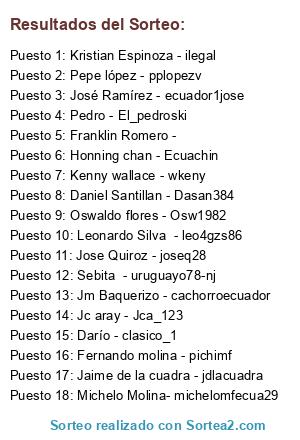 Lista de participantes: Kristian Espinoza - ilegal, Jc aray - Jca_123, Jose Quiroz - joseq28, Pedro - El_pedroski, Daniel Santillan - Dasan384, Oswaldo flores - Osw1982, Michelo Molina- michelomfecua29, Sebita - uruguayo78-nj, Pepe lópez - pplopezv, José Ramírez - ecuador1jose, Jaime de la cuadra - jdlacuadra, Jm Baquerizo - cachorroecuador, Honning chan - Ecuachin, Leonardo Silva - leo4gzs86, Darío - clasico_1, Kenny wallace - wkeny, Fernando molina - pichimf, Franklin Romero -.