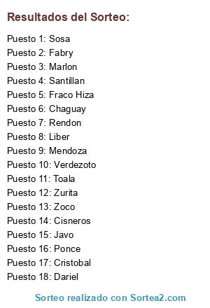 Lista de participantes: Santillan, Rendon, Ponce, Zoco, Dariel, Sosa, Mendoza, Liber, Javo, Fraco Hiza, Cristobal, Marlon, Verdezoto, Fabry, Chaguay, Cisneros, Zurita, Toala.