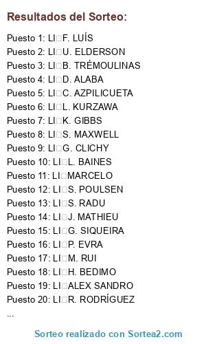 Lista de participantes: LI D. ALABA, LI F. LUÍS, LI L. BAINES, LI J. ALBA, LI MARCELO, LI C. AZPILICUETA, LI U. ELDERSON, LI R. RODRÍGUEZ, LI P. EVRA, LI D. CRISCITO, LI G. SIQUEIRA, LI B. TRÉMOULINAS, LI A. KOLAROV, LI S. POULSEN, LI N. BOILESEN, LI H. CABRAL, LI M. RUI, LI P. VAN AANHOLT, LI L. KURZAWA, LI S. MAXWELL, LI G. CLICHY, LI ALEX SANDRO, LI J. MATHIEU, LI H. BEDIMO, LI ADRIANO, LI S. RADU, LI F. COENTRÃO, LI M. DARMIAN, LI V. ANTUNES, LI K. GIBBS.