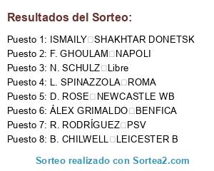 Lista de participantes: R. RODRÍGUEZ PSV, F. GHOULAM NAPOLI, L. SPINAZZOLA ROMA, D. ROSE NEWCASTLE WB, ÁLEX GRIMALDO BENFICA, ISMAILY SHAKHTAR DONETSK, B. CHILWELL LEICESTER B, N. SCHULZ Libre.