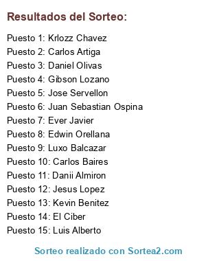 Lista de participantes: Luis Alberto, Carlos Artiga, Jose Servellon, Krlozz Chavez, Danii Almiron, Gibson Lozano, Jesus Lopez, Carlos Baires, Juan Sebastian Ospina, Daniel Olivas, Kevin Benitez, Ever Javier, Edwin Orellana, Luxo Balcazar, El Ciber.