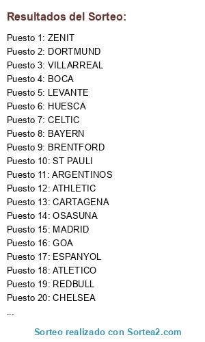 Lista de participantes: VILLARREAL, OSASUNA, LIVERPOOL, AJAX, ESPANYOL, ATLETICO, BOCA, ATHLETIC, IBIZA, HUESCA, MADRID, MANCHESTER UNITED, ZENIT, BETIS, BARCELONA, PSG, CARTAGENA, LEVANTE, DORTMUND, BAYERN, REDBULL, ST PAULI, HUDDERSFIELD, CHELSEA, CELTIC, VALENCIA, GOA, REAL ZARAGOZA, ARGENTINOS, BRENTFORD, INTER, GIJON.