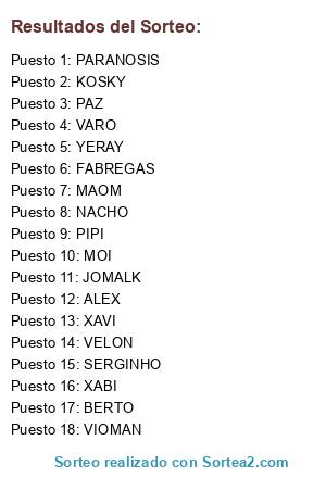 Lista de participantes: MAOM, PARANOSIS, SERGINHO, FABREGAS, KOSKY, BERTO, VIOMAN, PIPI, MOI, JOMALK, XAVI, PAZ, VELON, ALEX, XABI, YERAY, VARO, NACHO.