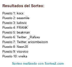 Lista de participantes: Link_DS, ericruiz, Kratos3D, kocx, Neon20, Alize, Acustiko , D.Vader, vicovico, beakman, seasmile, FRANK, Anita, ludovic, Rafa Lopez, vreika, Twitter: zfrankzz, Twitter: Daviliyo, Twitter: _Rafaxu, Twitter: Jorene75, Twitter: Isa25A, Twitter: ericombeicom, Twitter: Acustiko1, Twitter: reulaj.