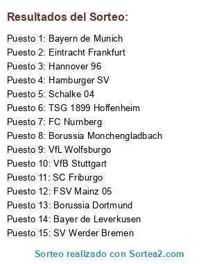 Lista de participantes: Bayern de Munich, Borussia Dortmund, Schalke 04, Bayer de Leverkusen, Hamburger SV, VfB Stuttgart, VfL Wolfsburgo, Borussia Monchengladbach, Eintracht Frankfurt, Hannover 96, TSG 1899 Hoffenheim, SV Werder Bremen, SC Friburgo, FSV Mainz 05, FC Nurnberg.
