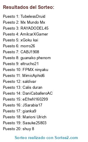 Lista de participantes: Marioni Ulrich, eltrucho21, Mx Mundo Mx, TubelessDruid, JSarabia17, saldivar, AmilcarXGamer, RAYADODEL45, CABJ1908, Sasuke25803, DaniCaballeroAC, Calis duran, xGoku kai, gianka9, morro26, shuy 8, MimicAphid6, eEfreN160299, guanako phenom, FPMX ninyaku.